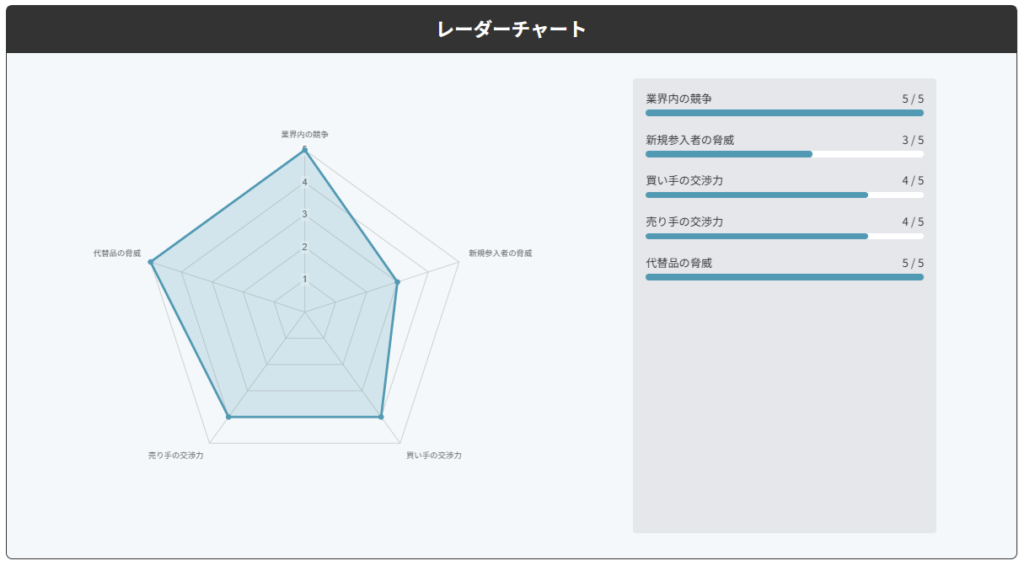 ビジネスを取り巻く5つの脅威(5フォース)をAIが5段階評価で採点し、レーダーチャートで可視化します。事業の弱点や課題を簡単に特定でき、今後の対応策を立てるのに役立ちます。