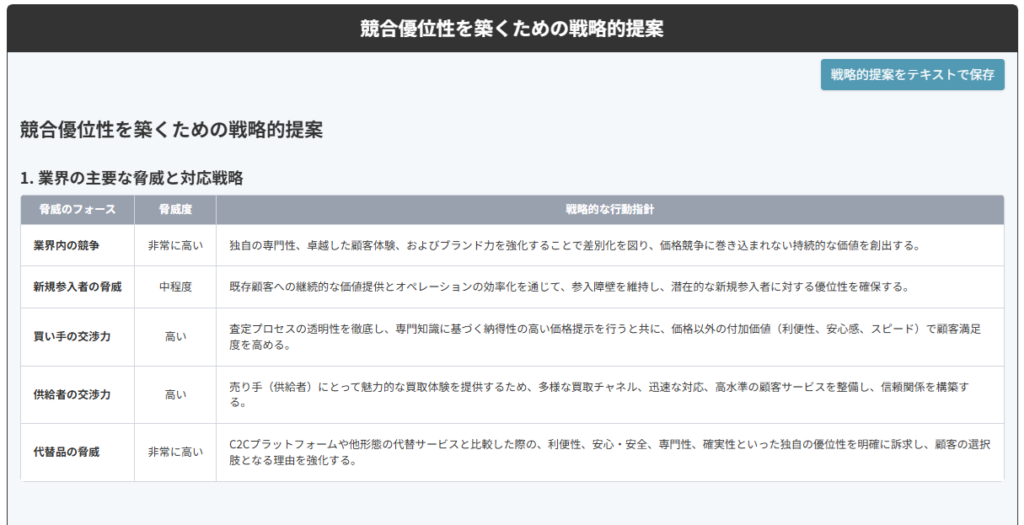 ポジショニングマップから戦略提案まで、すべての分析結果をPDF形式で一括ダウンロードできます。会議資料や提案書などに活用可能です。